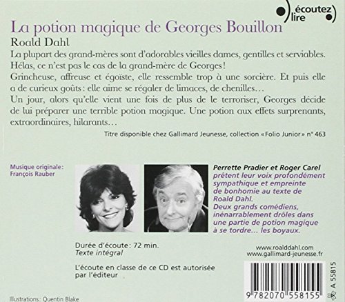 C'est un vrai bonheur que de suivre le petit Georges dans sa confection de la plus infâme mixture qui soit, composée de tout ce que la maison contient de moins appétissant: vernis à ongles, cirage, peinture, savon, tout atterrit dans le chaudron. Le genre de tambouille que tout enfant a rêvé de faire. Avec Georges, on s'offre le plaisir... sans la grosse fessée qui risquerait de récompenser ce genre d'exploit dans la vraie vie. Dans le livre, on a le droit de tout faire et surtout, la magie existe. Elle crée la barrière entre le monde réel et celui du conte, aucune confusion n'est possible. Rassurant pour les parents! Et les dessins du grand illustrateur Quentin Blake sont simplement hilarants. --Pascale WesterRang parmi les ventes Amazon: #210247 dans LivresPublié le: 2004-03-18Nombre de disques: 1Format: CD-ROMLangue d'origine: AnglaisNombre d'articles: 1Dimensions: 4.88" h x 5.47" l x .24" L, Durée: 72 minutesReliure: CD-RAmazon.frLa grand-mère de Georges n'est pas de ces adorables mamies gâteaux qui racontent des histoires et offrent des bonbons. Elle serait plutôt du genre sorcière, méchante et aimant faire peur aux enfants. Puisque c'est une sorcière, Georges décide de la transformer en lui concoctant une potion magique à sa façon. Du genre explosif. Une potion qui aura des effets plutôt inattendus... C'est un vrai bonheur que de suivre le petit Georges dans sa confection de la plus infâme mixture qui soit, composée de tout ce que la maison contient de moins appétissant: vernis à ongles, cirage, peinture, savon, tout atterrit dans le chaudron. Le genre de tambouille que tout enfant a rêvé de faire. Avec Georges, on s'offre le plaisir... sans la grosse fessée qui risquerait de récompenser ce genre d'exploit dans la vraie vie. Dans le livre, on a le droit de tout faire et surtout, la magie existe. Elle crée la barrière entre le monde réel et celui du conte, aucune confusion n'est possible. Rassurant pour les parents! Et les dessins du grand illustrateur Quentin Blake sont simplement hilarants. --Pascale WesterRevue de presseDeux grands comédiens, Perrette Pradier et Roger Carel, inénarrablement drôles dans une partie de potion magique à se tordre... les boyaux. Durée d'écoute:72 mn.Présentation de l'éditeurLa plupart des grands-mères sont d'adorables vieilles dames, gentilles et serviables. Hélas, ce n'est pas le cas de celle de Georges! Grincheuse, affreuse et égoïste, elle ressemble à une sorcière. Et puis elle a de drôles de goûts:elle se régale de limaces et de chenilles…Un jour, alors que sa grand-mère vient une fois de plus de le terroriser, Georges s'enferme dans la cuisine pour lui préparer une redoutable potion magique. Une potion aux effets surprenants, extraordinaires, hilarants…Même les grands-mères s'amuseront à entendre cette histoire!
